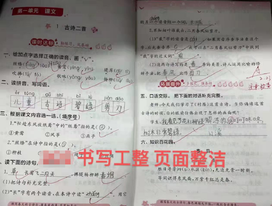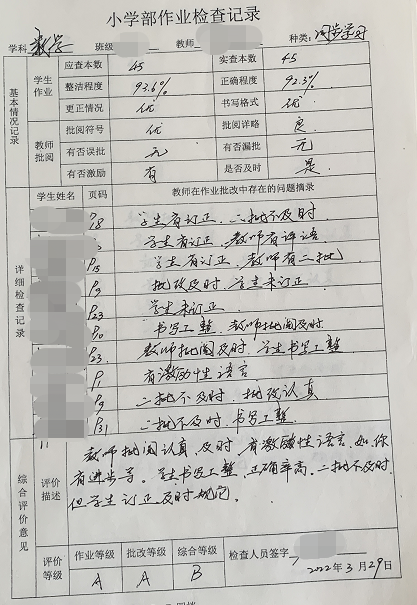 本次作業(yè)檢查以“學(xué)生完成情況”“訂正情況”“批改情況”“復(fù)批情況”為主要內(nèi)容。從檢查中看到,教師批閱認(rèn)真及時,全批全改,有等級、有日期;作業(yè)干凈整潔、書寫工整;教師使用個性化鼓勵、指導(dǎo)性語言評價,不同程度地激發(fā)了學(xué)生高質(zhì)量完成作業(yè)的興趣。不僅如此,教師們還嚴(yán)格按照“雙減”政策要求,作業(yè)布置規(guī)范,內(nèi)容科學(xué)、適量,注重學(xué)生綜合能力的提升。