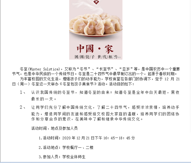 本次活動(dòng)到這里就圓滿結(jié)束啦!在這寒冷的冬日,我校全體師生一起進(jìn)行別樣的冬至食育活動(dòng),提高了學(xué)生們的動(dòng)手實(shí)踐能力的同時(shí),也增進(jìn)了師生情,縮短了心與心之間的距離。